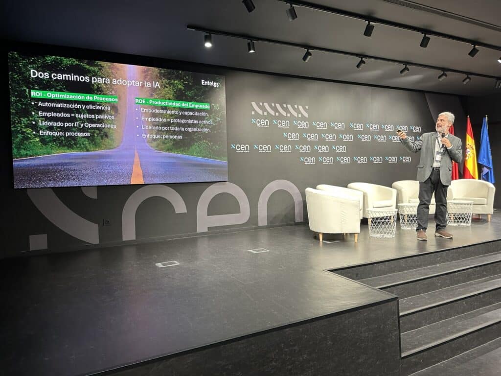 Roberto Rey Granado, director de negocio en Navarra, demostró en directo cómo la IA ya acompaña a los líderes. Su intervención subrayó que el liderazgo en esta nueva era no se ejerce en soledad. Ángel Echevarría, director de Entelgy Ibai, reforzó esta idea al señalar que el impacto de la IA depende del liderazgo que la guíe. Por nuestra parte, en Entelgy acompañamos a las organizaciones no solo con soluciones tecnológicas exclusivamente, lo hacemos con una estrategia integral de adopción de IA: analizamos los procesos, formamos a los equipos, medimos riesgos éticos y legales, y alineamos cada paso con los valores corporativos.